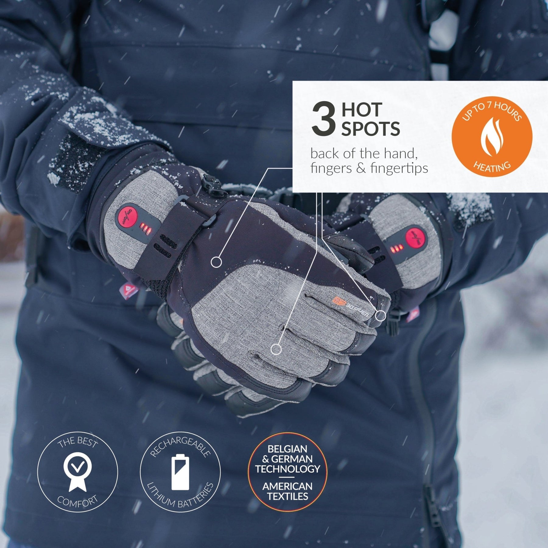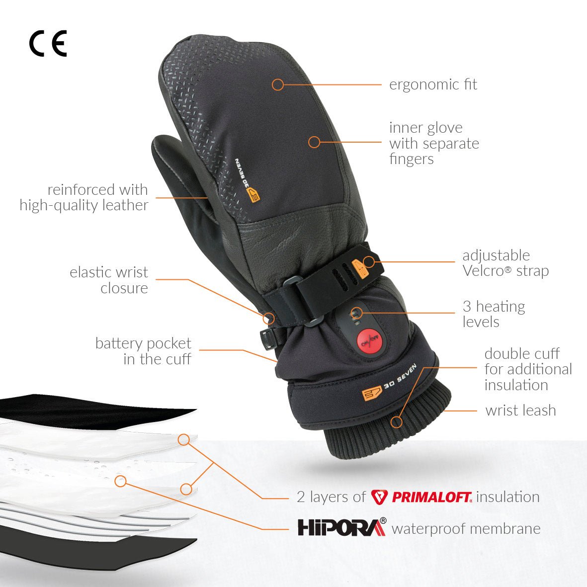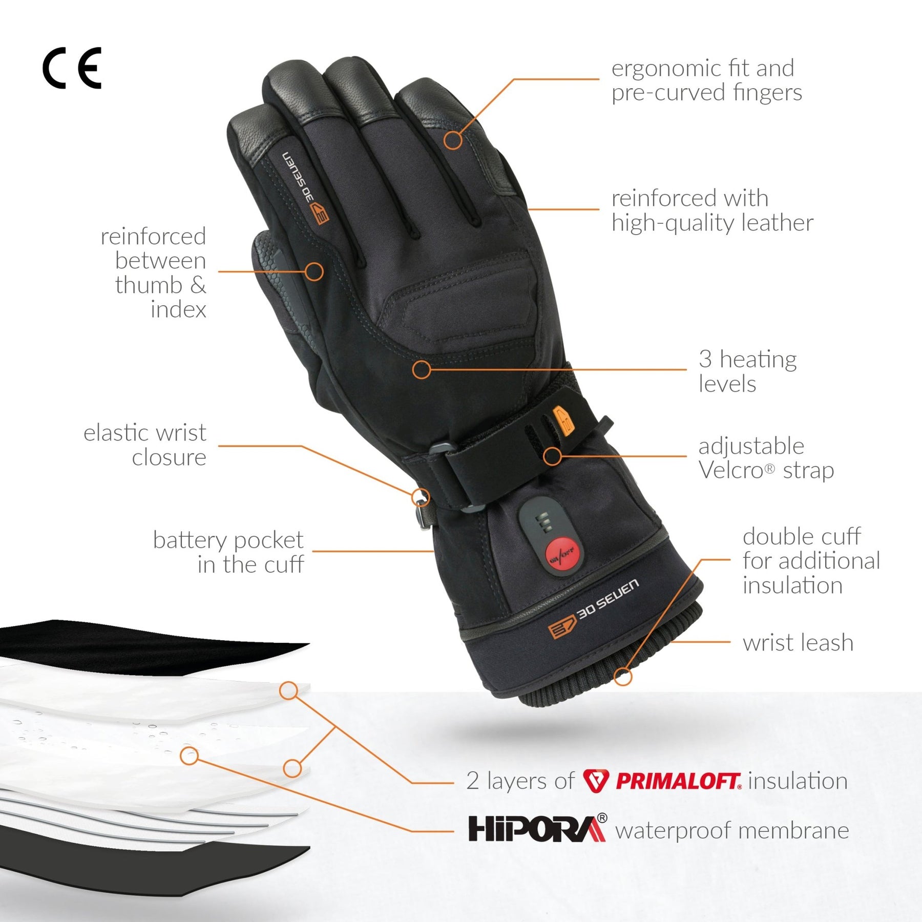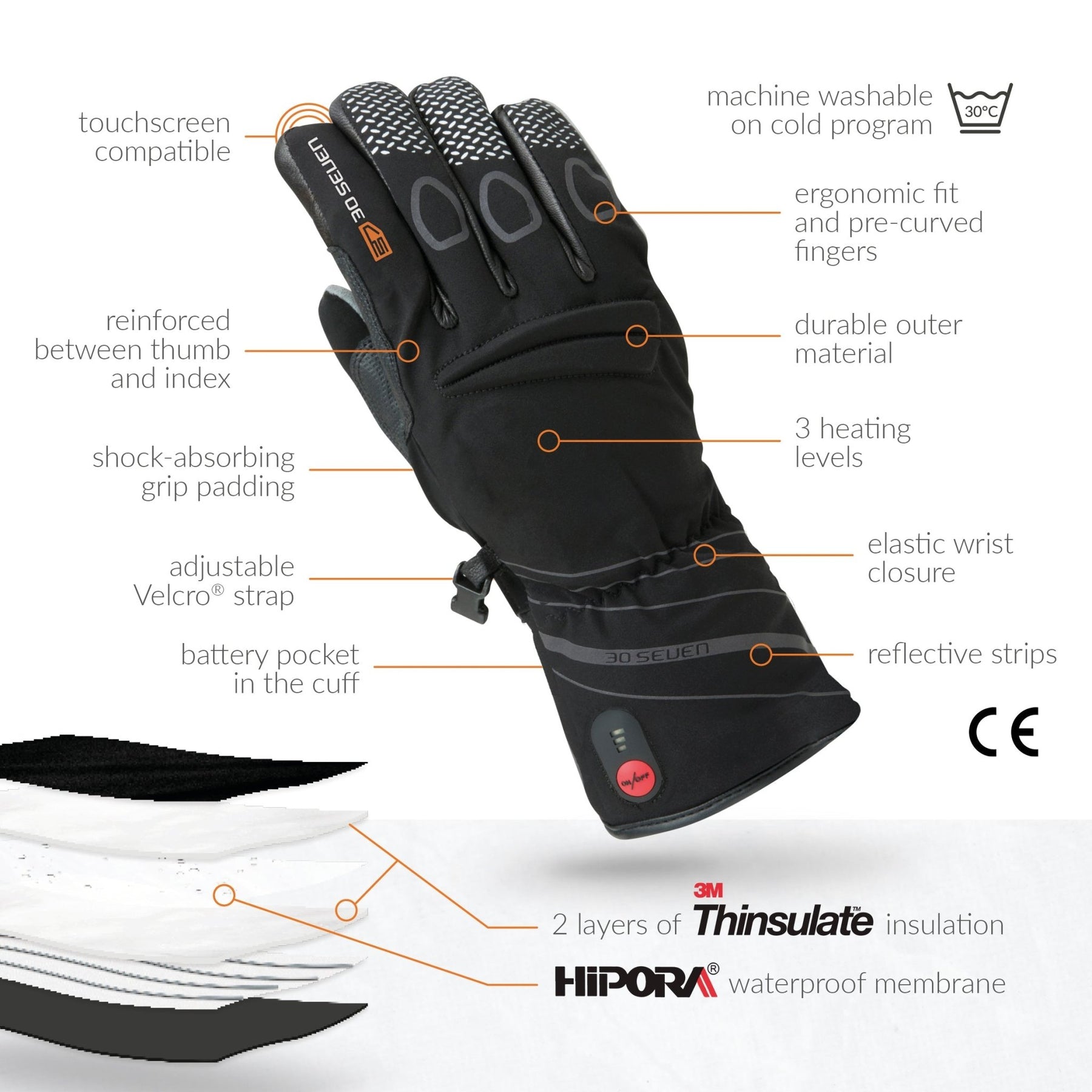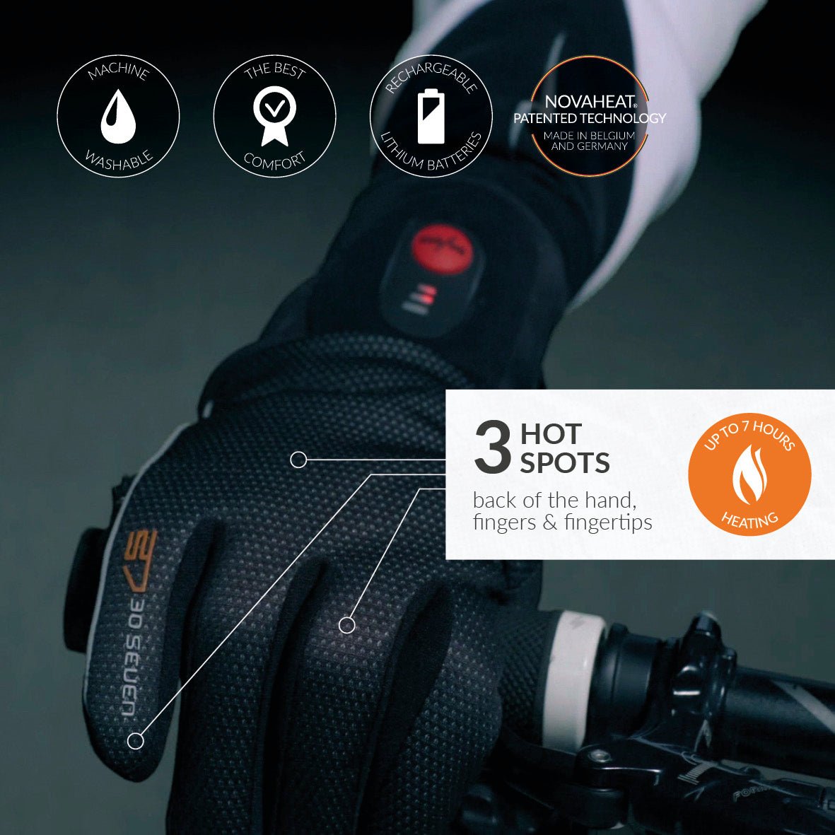 RECHARGEABLE HEATED GLOVES: 30seven's most versatile heated glove. Novaheat® technology with hot spots on back of the hand, fingers and fingertips. Quality German/Belgian tech and American textiles (Primaloft & 3M Thinsulate), assembled in Europe.