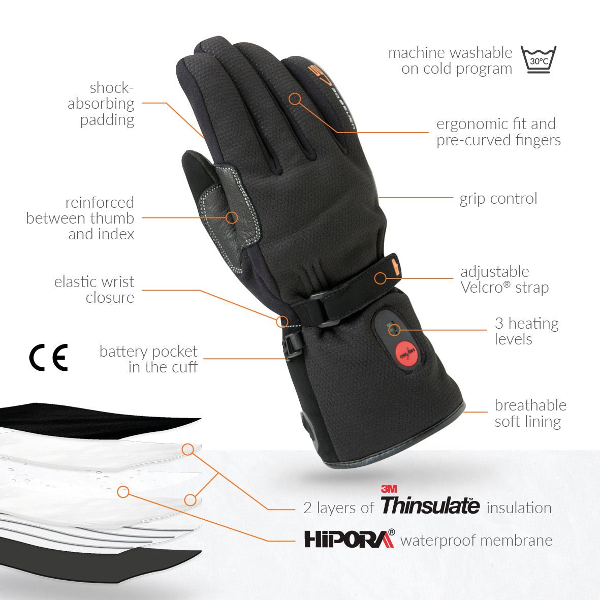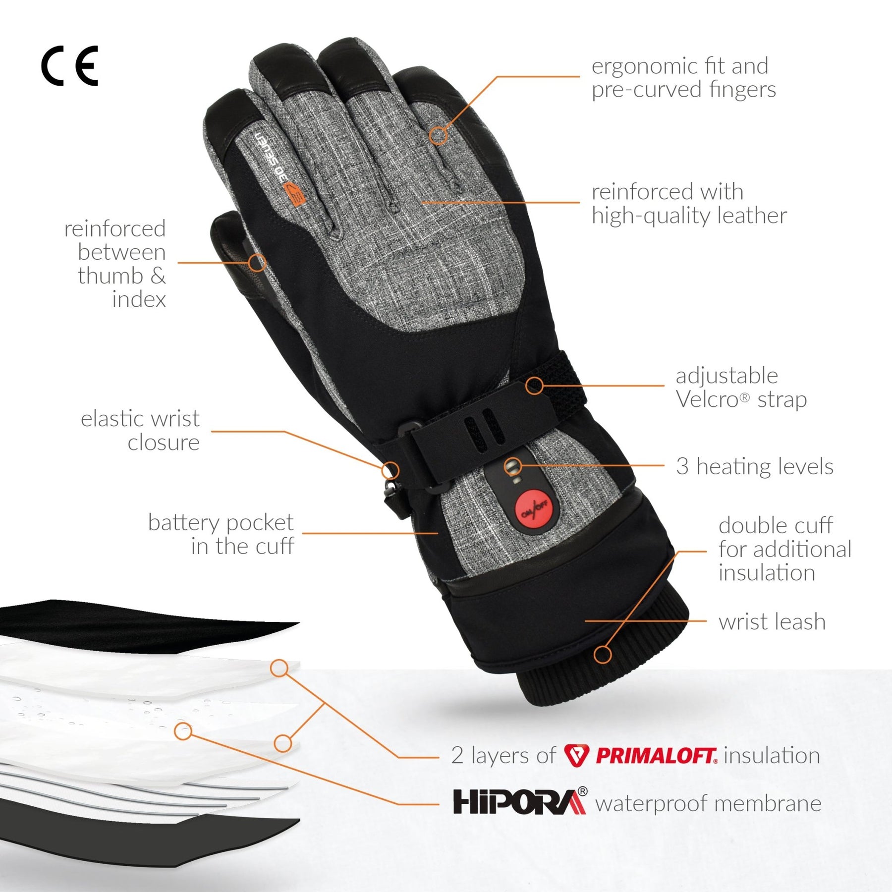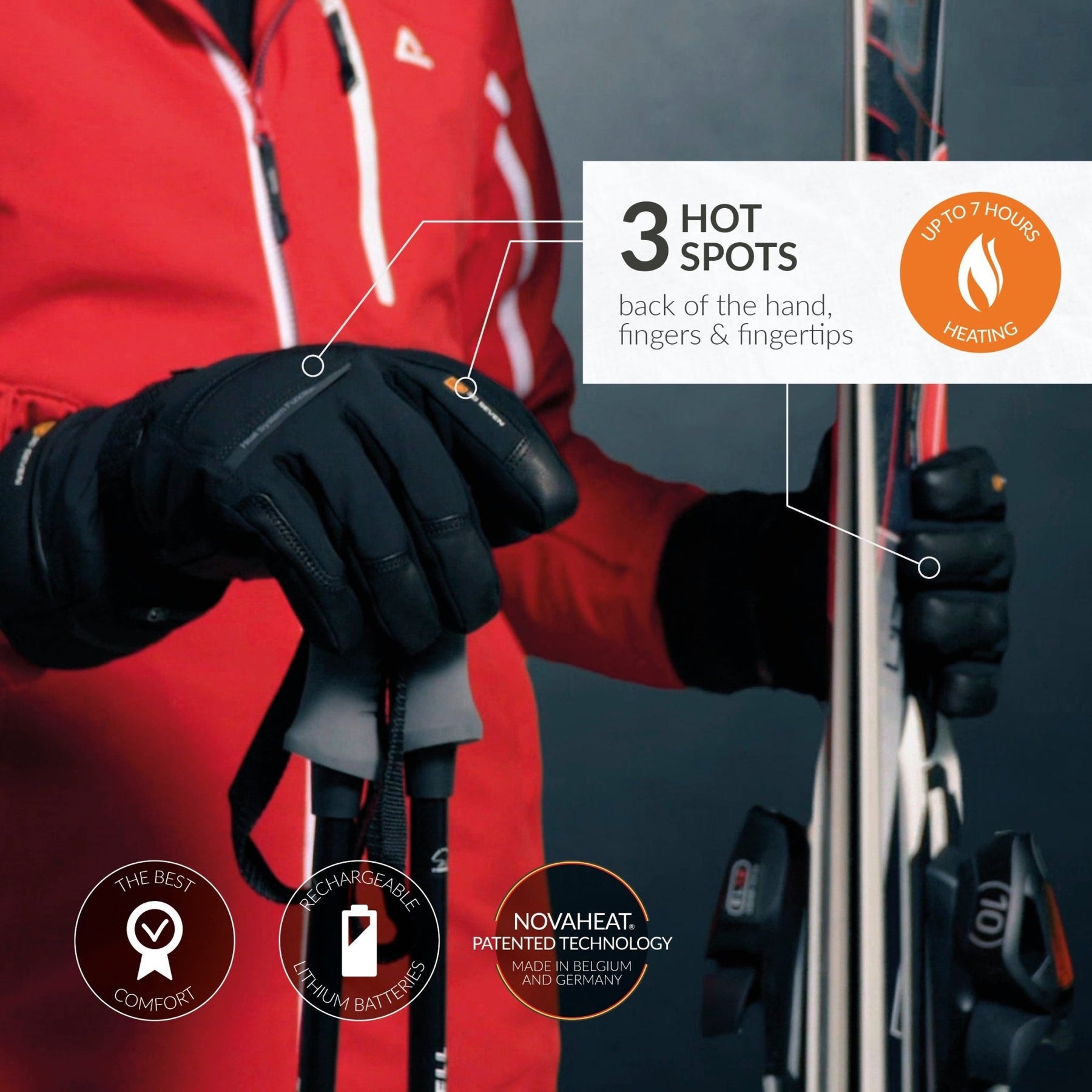 RECHARGEABLE HEATED GLOVES: Electric heated gloves deliver Novaheat® technology with hot spots on back of the hand, fingers and fingertips. Quality German/Belgian technology and American textiles (Primaloft & 3M Thinsulate), assembled in Europe.