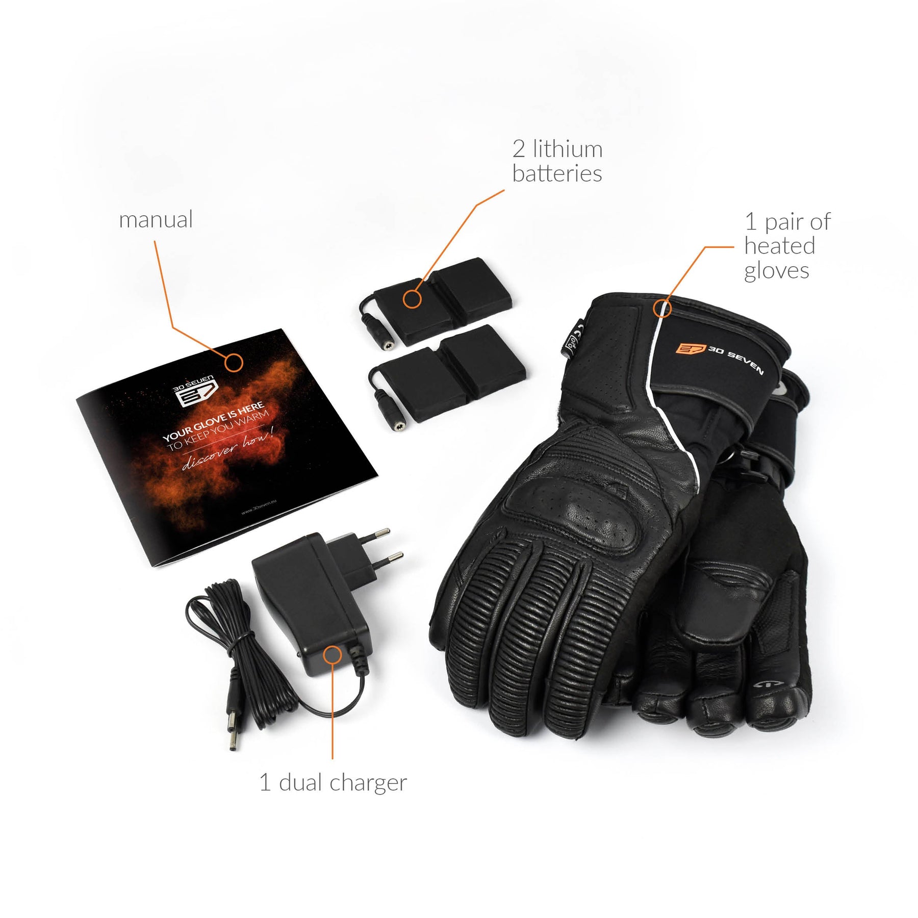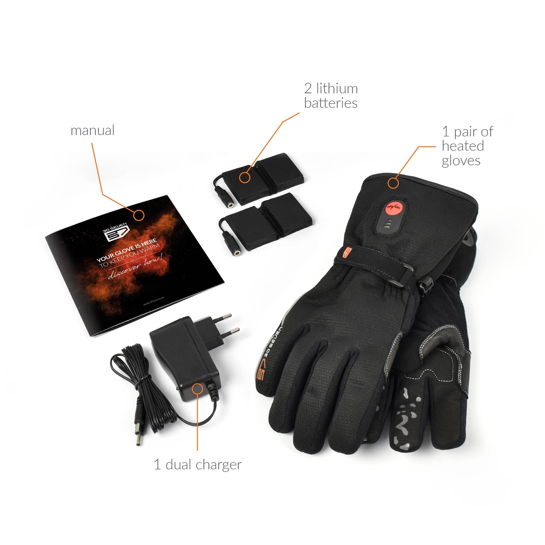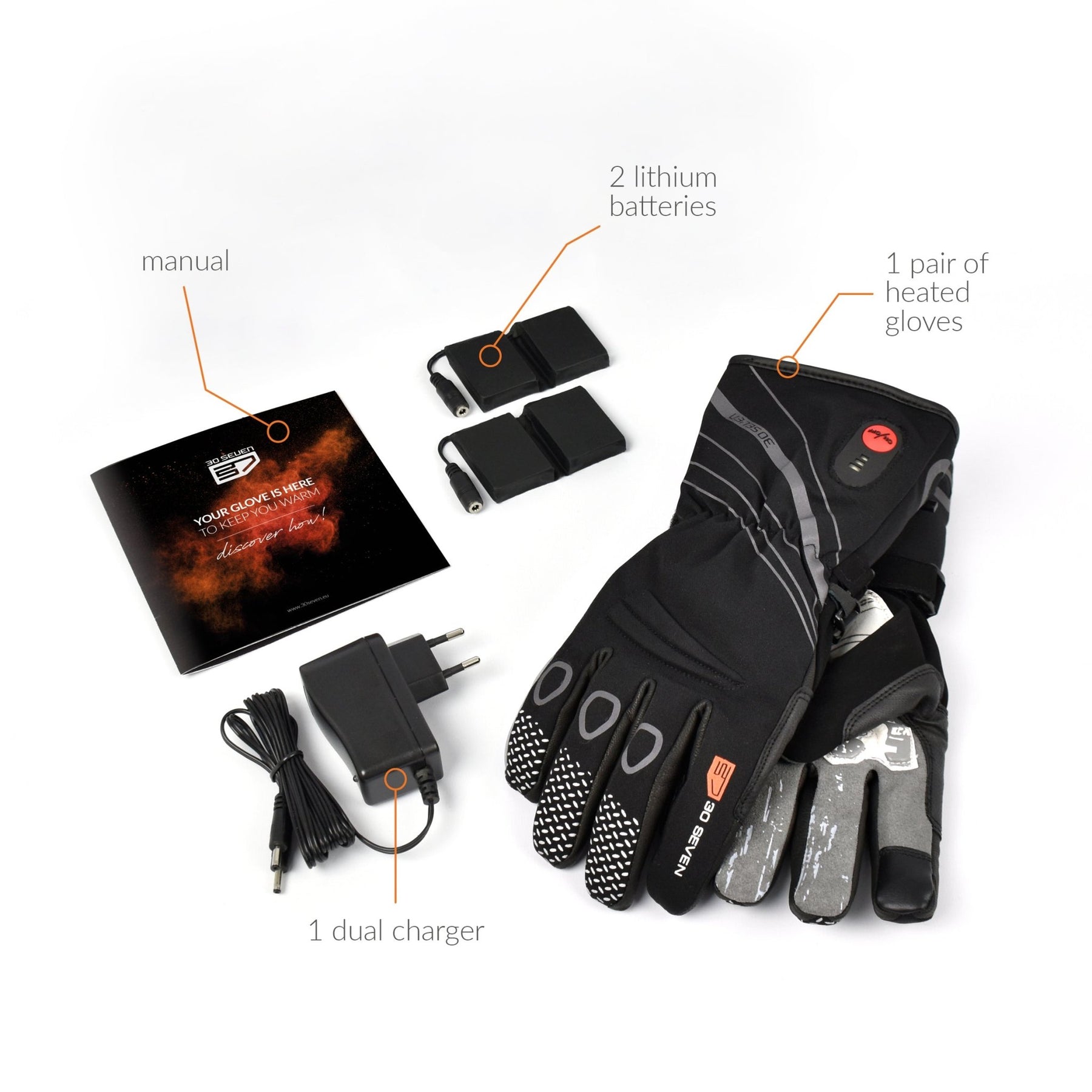 This pack contains everything you need: 1 pair of gloves, 2 rechargeable lithium-ion batteries and 1 dual charger