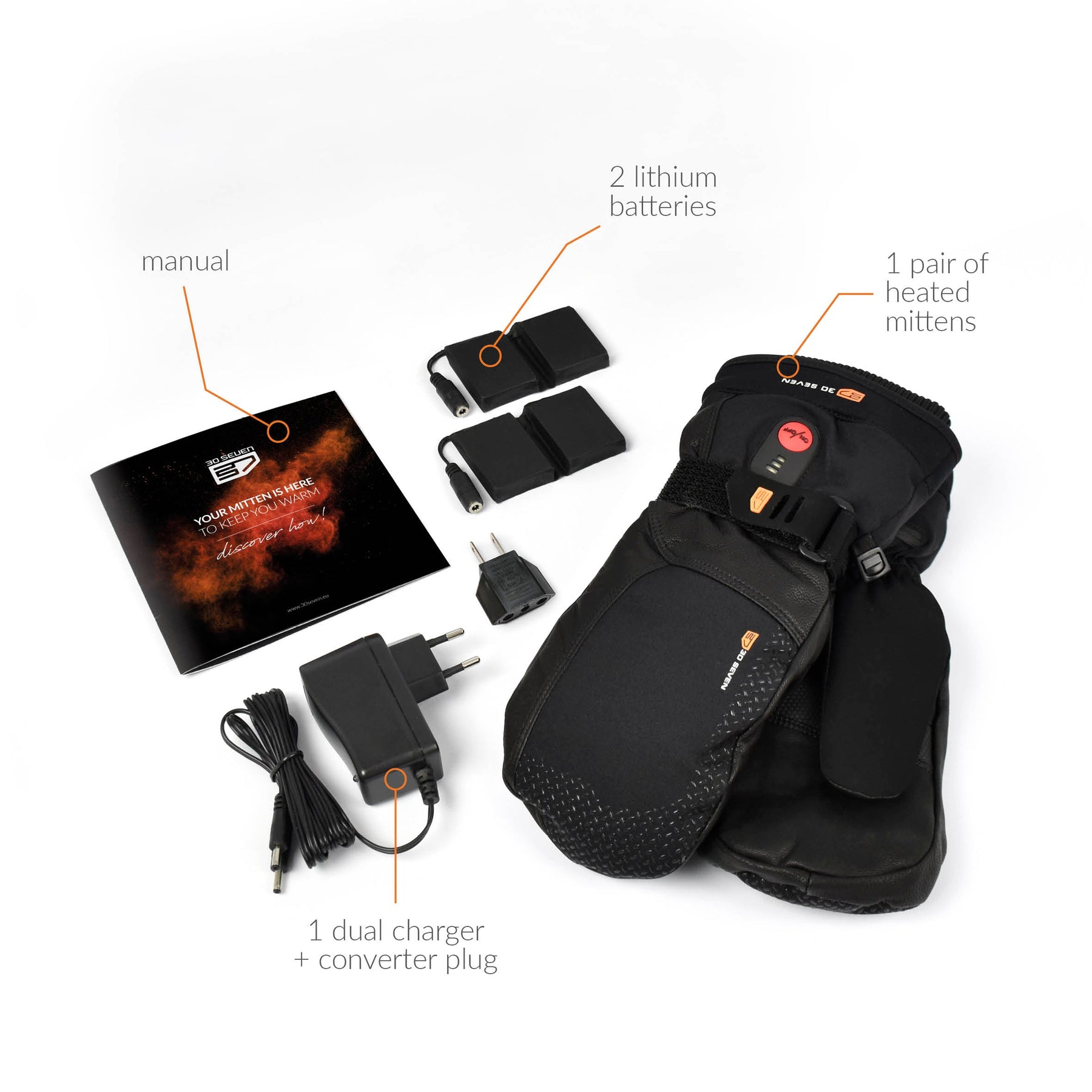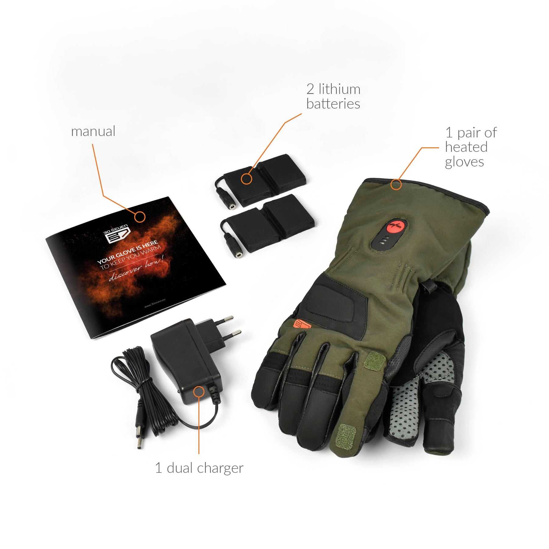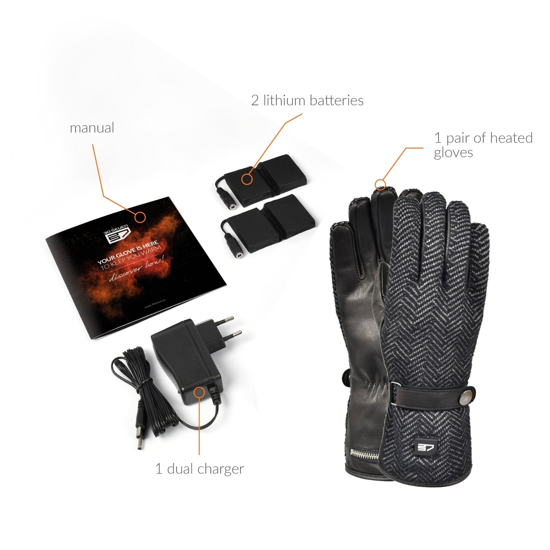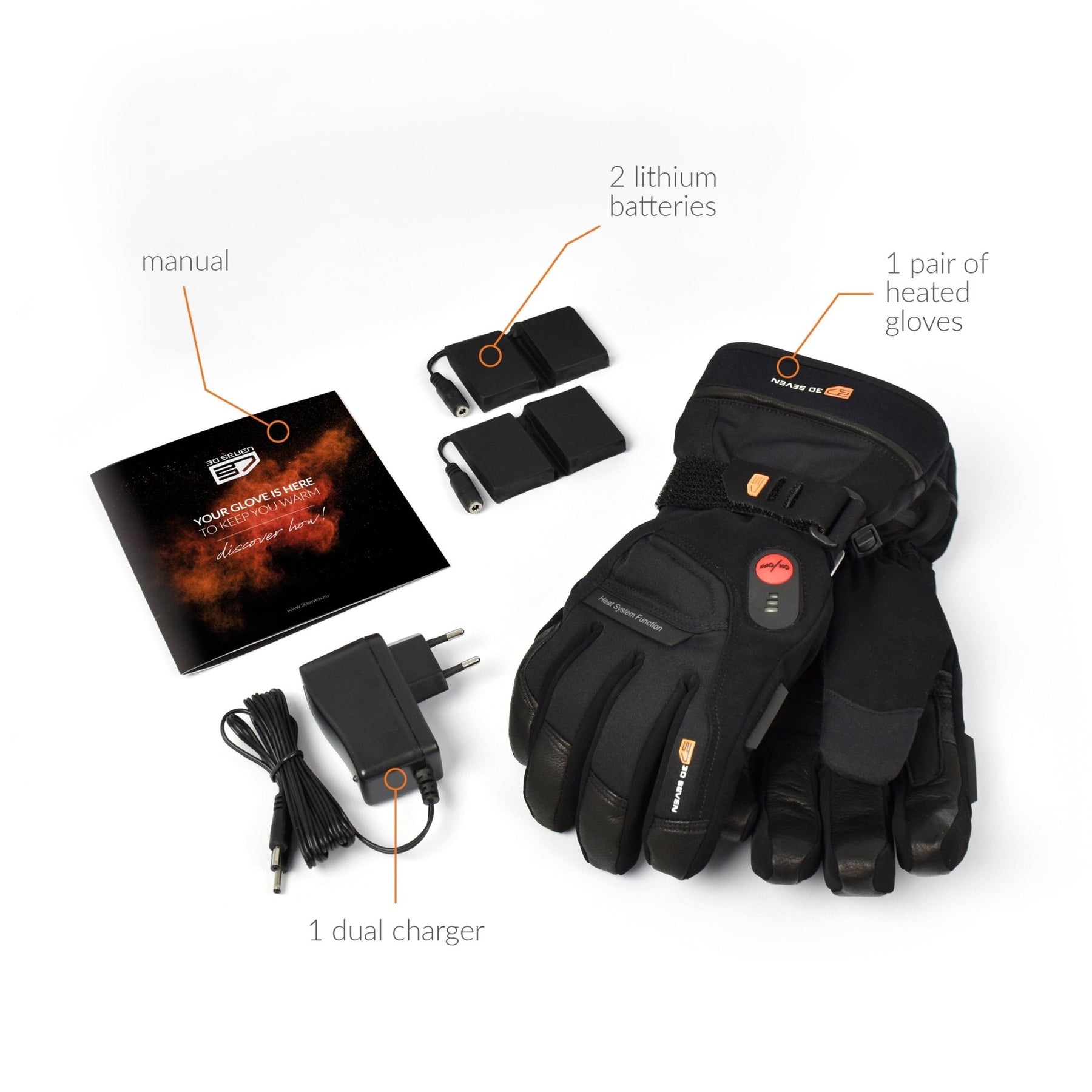 This pack contains everything you need: 1 pair of gloves, 2 rechargeable lithium-ion batteries and 1 dual charger