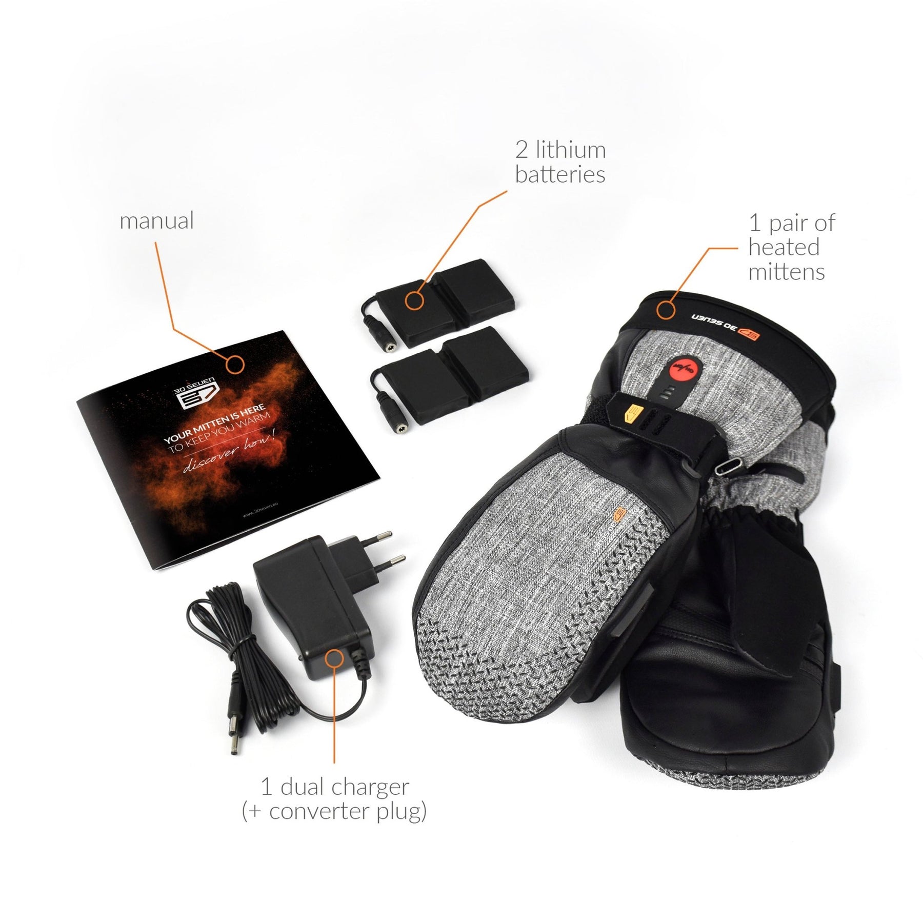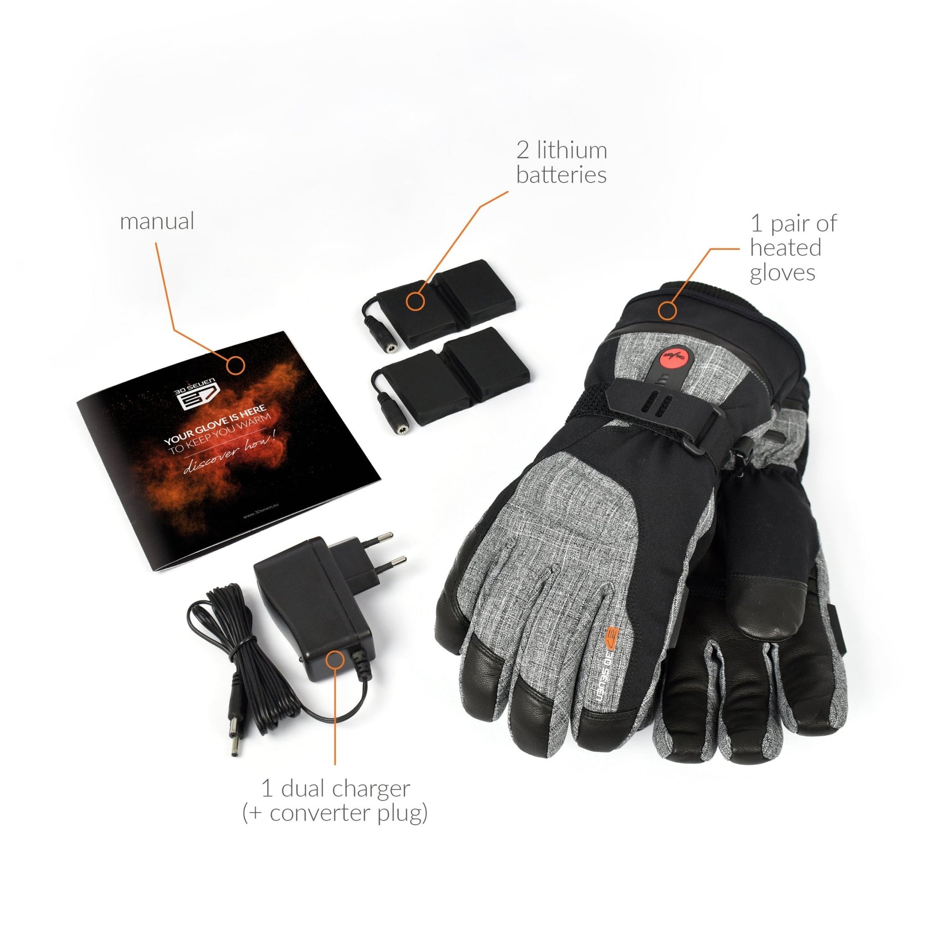 This package contains all you need: 1 pair of heated gloves extra warm, 2 rechargeable batteries and 1 dual charger