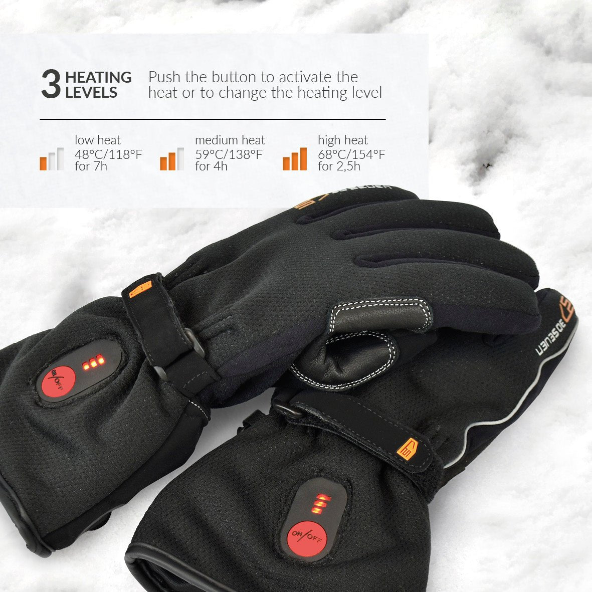 3 HEATING LEVELS: Low, medium, and high heat gloves for instant warmth and reliable temperature control. Battery life up to 7 hours on low setting, 2.5 hours on high setting. Recharges in approximately 4 hours.