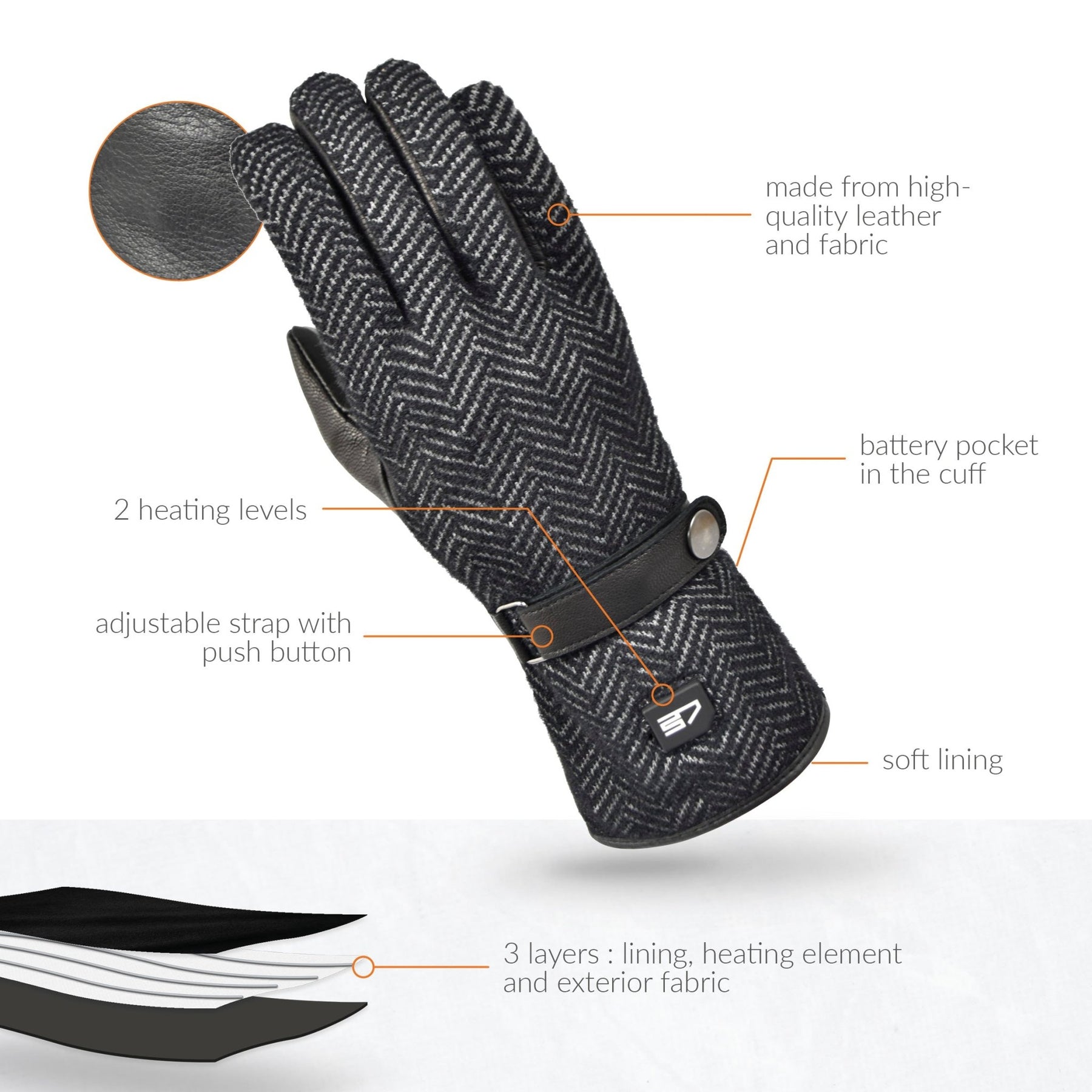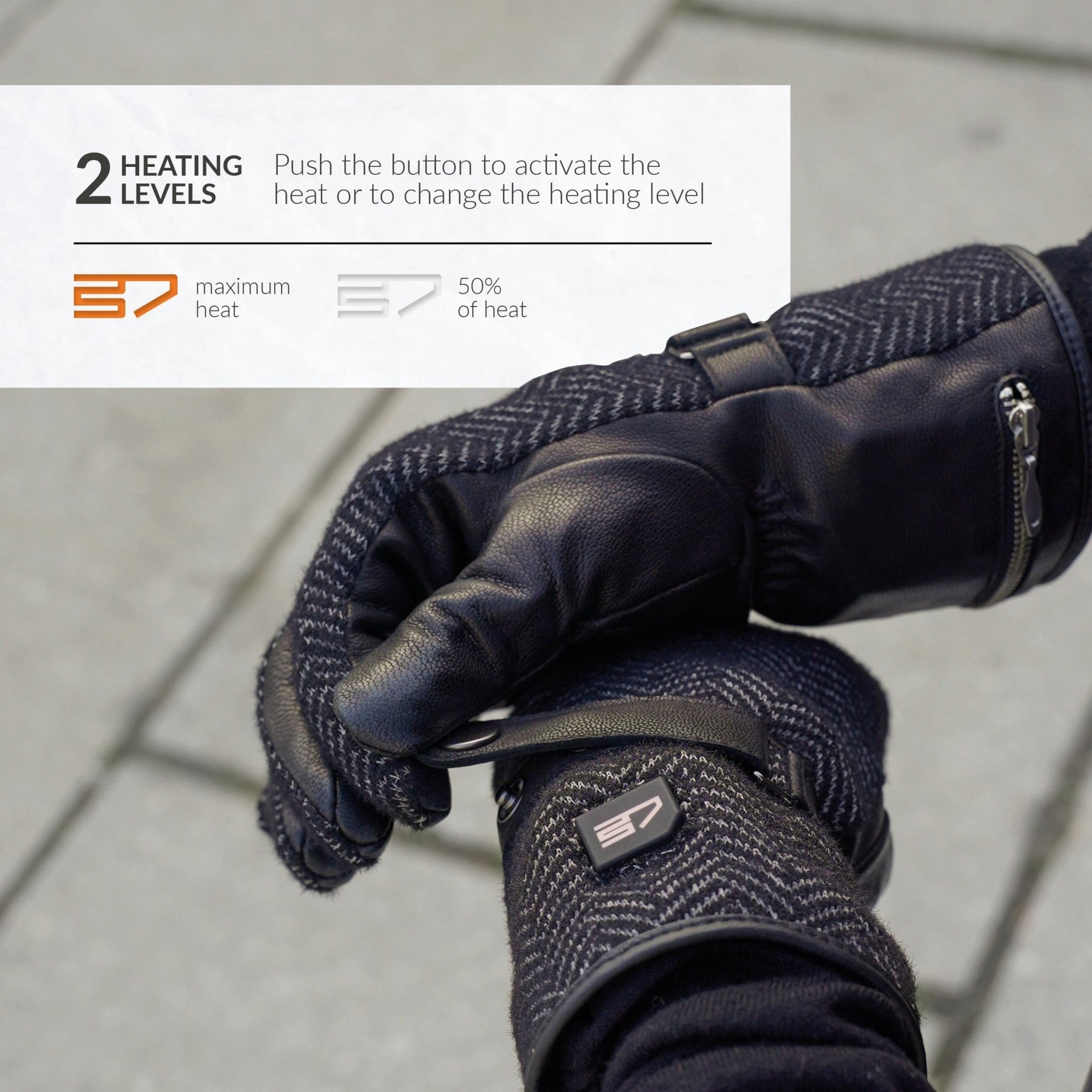 Specifications: - Breathable and soft lining - Hot spots: back of the hand, fingers and fingertips - Elastic wrist enclosure - Adjustable strap at wrist to ensure a perfect fit - Small pockets on the wrists to keep your batteries - Material: Shell: 55% leather, 45% polyester - Lining: 100% polyester - Included: pair of gloves, 2 rechargeable batteries, dual charger, manual