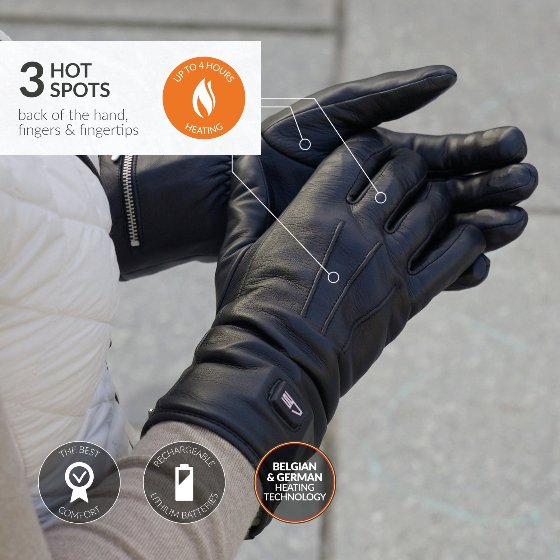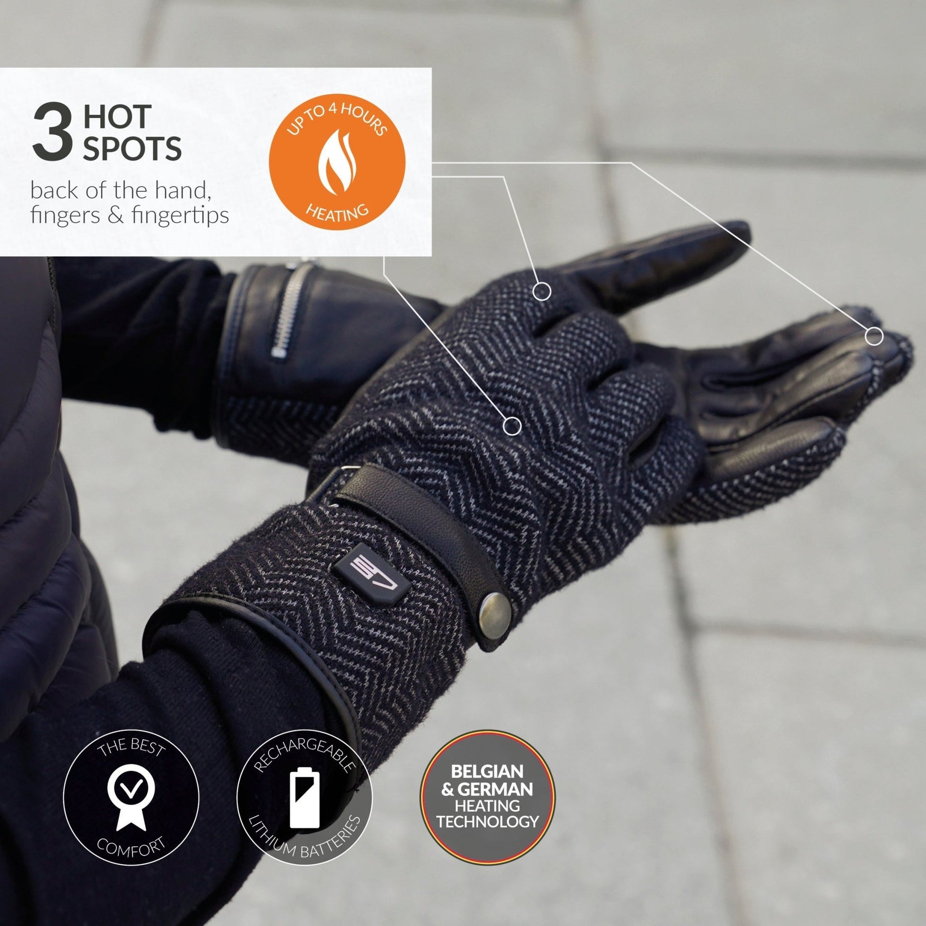 RECHARGEABLE HEATED GLOVES: Electric heated glove with Novaheat® technology feature hot spots on back of the hand, fingers and fingertips. Quality German/Belgian tech and American textiles (Primaloft & 3M Thinsulate), assembled in Europe.