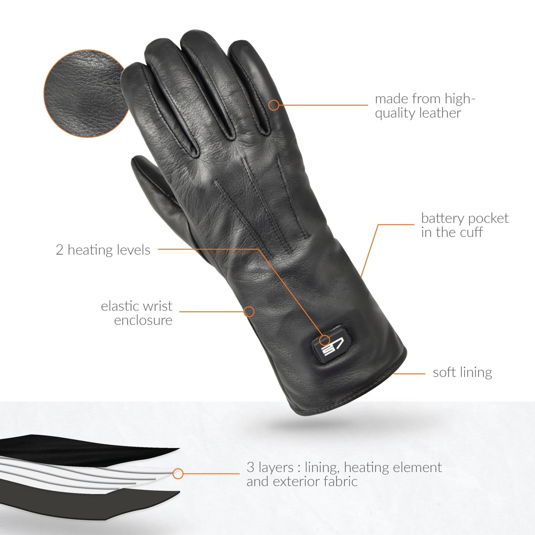 Specifications: - Breathable and soft lining - Hot spots: back of the hand, fingers and fingertips - Elastic wrist enclosure - Small pockets on the wrists to keep your batteries - Material: Shell: 100% leather - Lining: 100% polyester - Included: pair of gloves, 2 rechargeable batteries, dual charger, manual