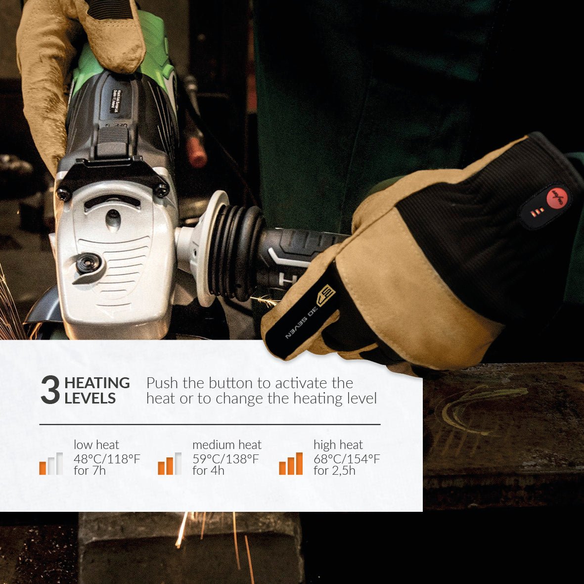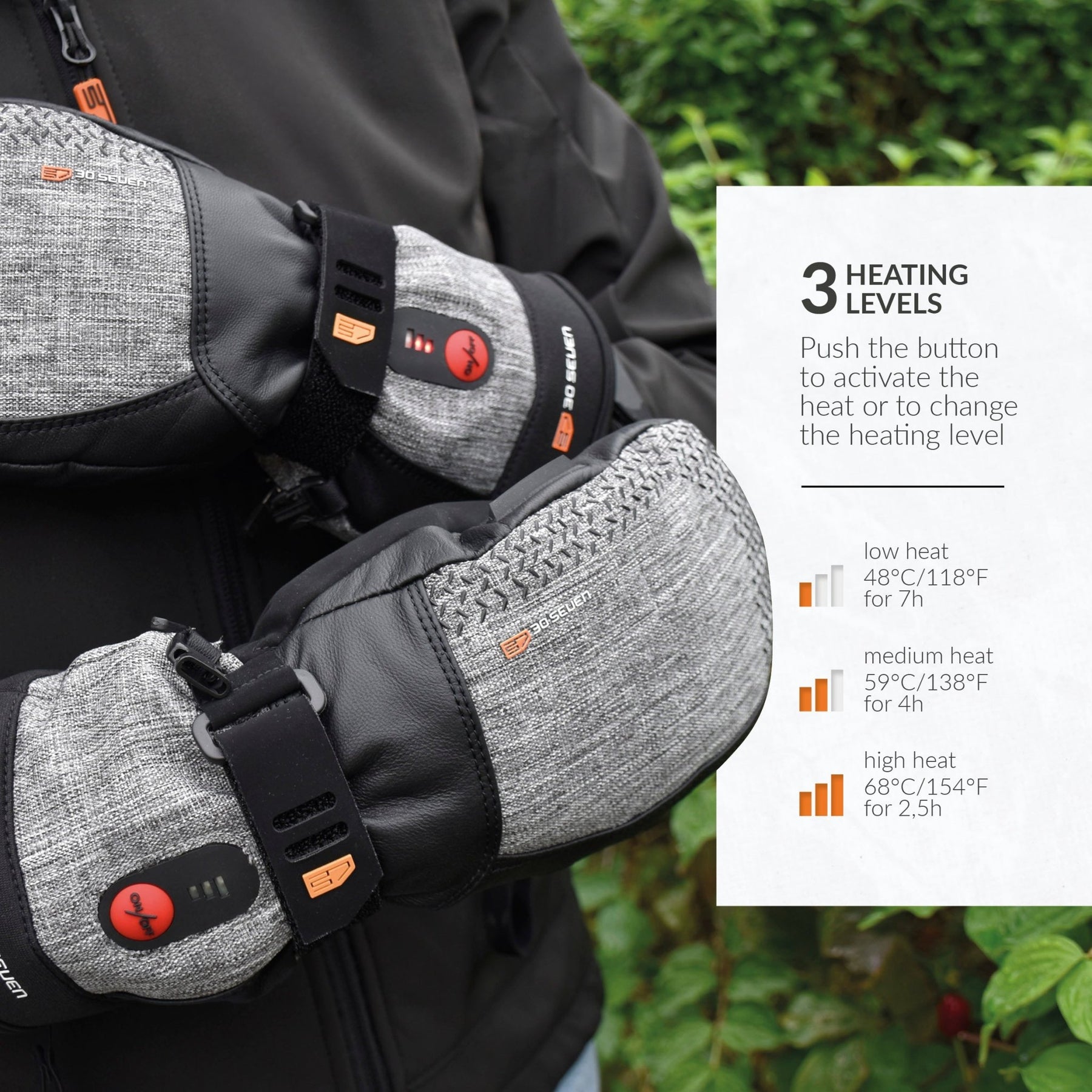 Super power: - works with 1 powerbank (included) - 4 heating levels - up to 5 hours of heating - only compatible with the 30seven® super powerbank - powerbank + charger included