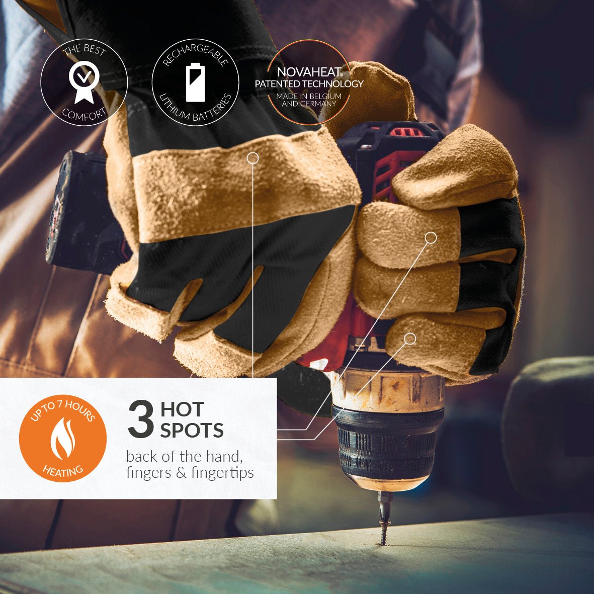 FOR OUTDOOR WORK: Extra durable electric heated gloves. Do the job with Novaheat® technology hot spots on back of the hand, fingers and fingertips. Quality German/Belgian tech and American textiles (Primaloft & 3M Thinsulate), assembled in Europe.